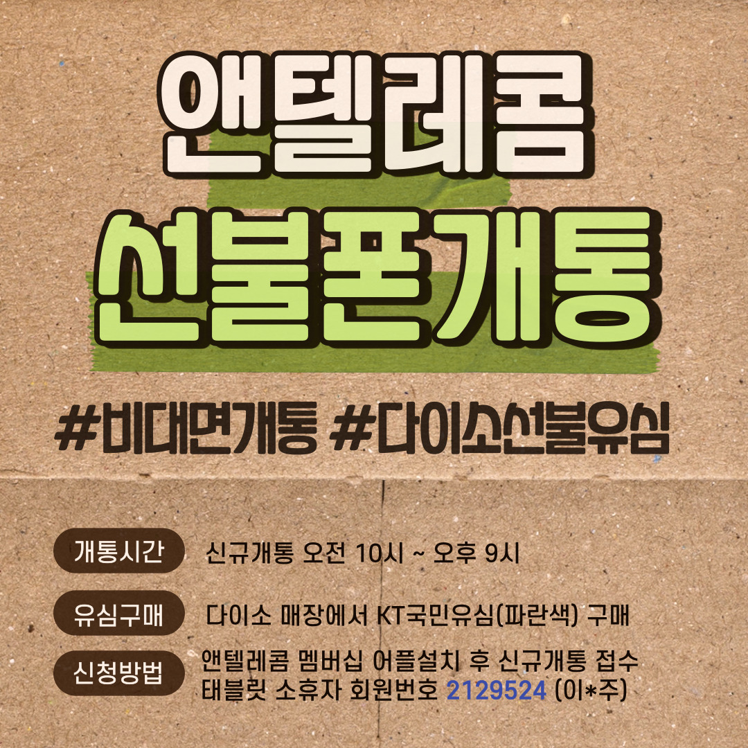 이 과정에서 비용을 내지 못하는 분은? 휴대폰을 사용할 수 없게 되죠. 이런 경우 유일한 해답은 "선불폰개통"입니다. 선불유심은 돈이 밀릴 이유가 없으므로 타 통신사에 요금이 연체된 경우라 할지라도 개통이 가능합니다. 그리고 이미 정지된 단말기에 개통된 선불유심을 끼우셔도 사용 하다는점!! 이런 이유 때문에 선불폰을 많은 분들이 찾습니다. 그리고 사용해본 분들은 대부분 만족하세요~ 위에 나온 방법대로 다이소 매장에서 유심을 구매한 후에, 앤텔레콤 멤버십 앱을 설치하시면 개통접수가 가능합니다.