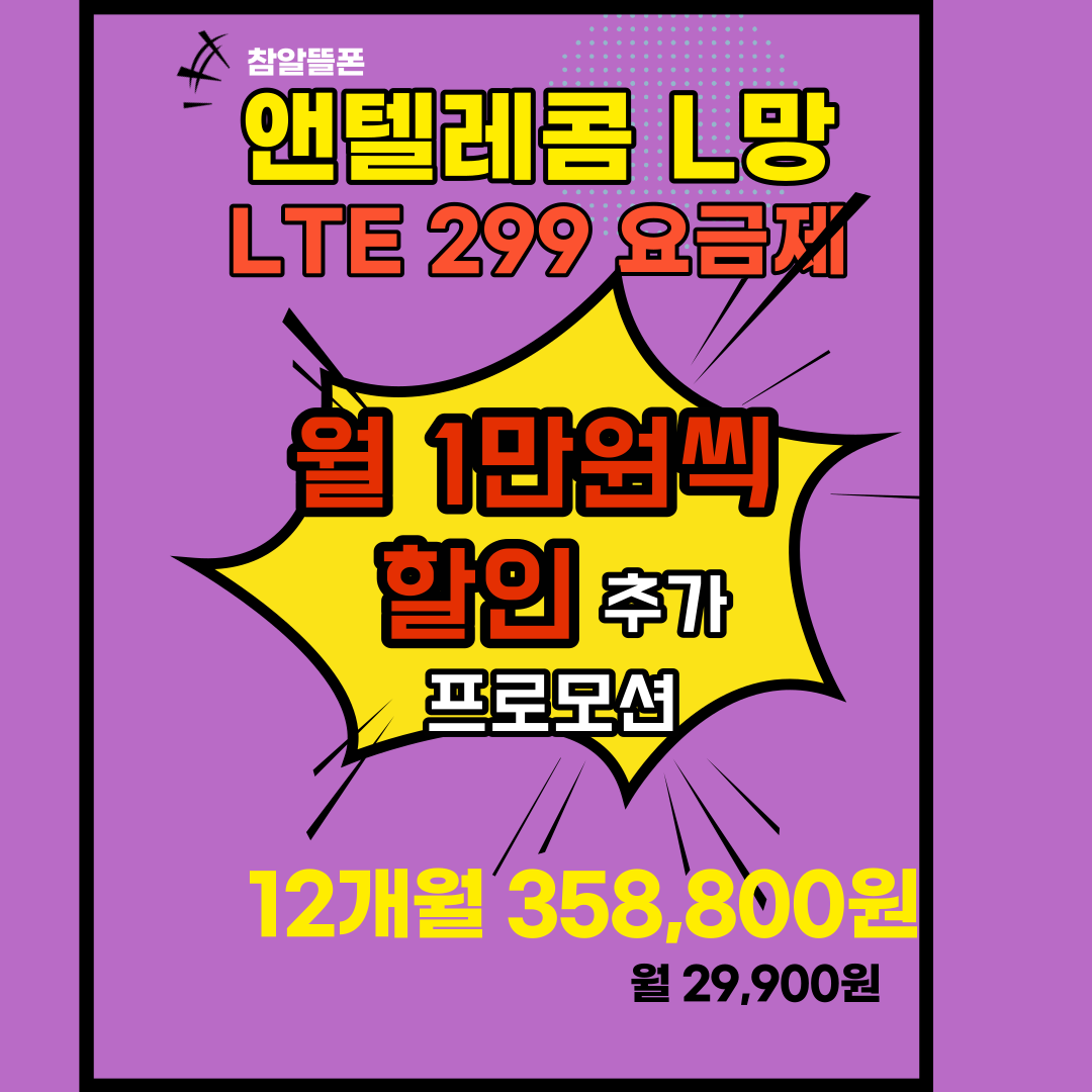 앤텔레콤에서 1년약정 프로그램을 만들면서 드리는 첫번째 혜택! 가성비 좋은 396 요금제를 1년 약정을 조건으로 월 1만원가까이 추가 할인합니다. 12개월 기준으로 358,800원입니다. 월 29,900원으로 통화, 문자, 데이터 모두 무제한으로 사용하실 수 있어요.
