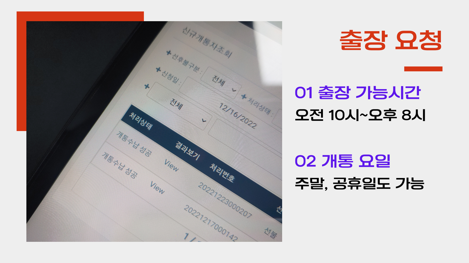 1,2 번이 불가능한 경우, 오전 9시 출근해서 밤에 퇴근하는 경우라던가, 멀리 지점을 방문하기 어려운 상황이라던가.. 담당자를 출장요청할 수 있습니다. 물론 수도권에 한하여지만 출장개통이 가능합니다. 현재는 모바일 본인인증이 필수이므로, 사전에 확인이 필요합니다! 담당자들은 개통 가능한 유심 및 태블릿 PC를 통해서 개통할 수 있는 만반의 준비를 하고있기때문에 만날 장소와 시간만 정확하게 정하셔서 진행하시면 됩니다. 개통 소요시간은 대략 20~ 30분 내외입니다.