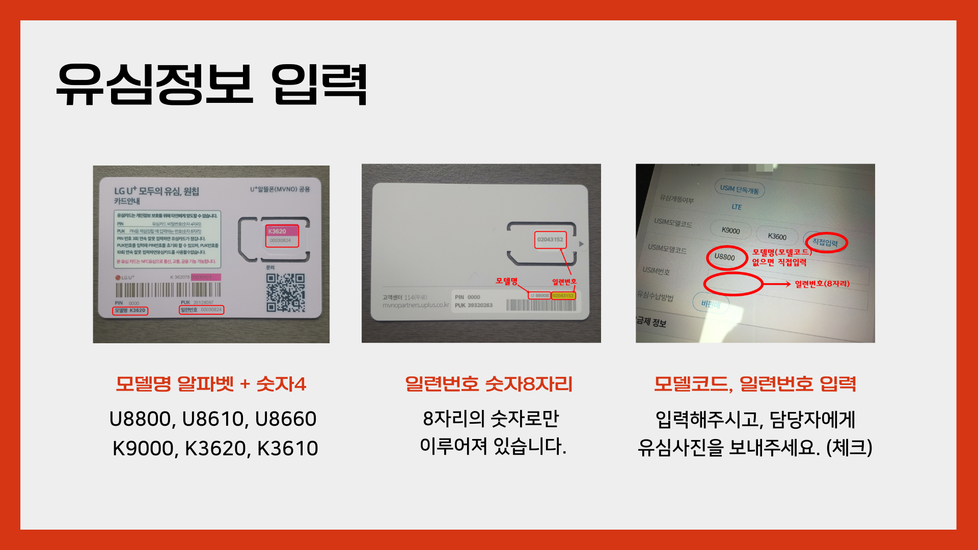 유심번호는 L망의 경우는 위와같습니다. 모델명, 일련번호 구성으로 되어있으며 모델명은 K9000, K3620, U8800 이런형태로 알파벳 + 숫자4자리로 구성되어 있으며 일련번호는 6~8 숫자로만 이루어져있습니다. 여기서 잘못입력해서 틀리는 경우가 많기때문에 개통승인 요청하실때 가지고 계신 유심 사진을 찍어주시는게 좋습니다. 담당자가 한번 더 검토해서 승인하니까요. 만약 잘못된 번호를 입력할 경우 처음부터 다시 진행하셔야 합니다.