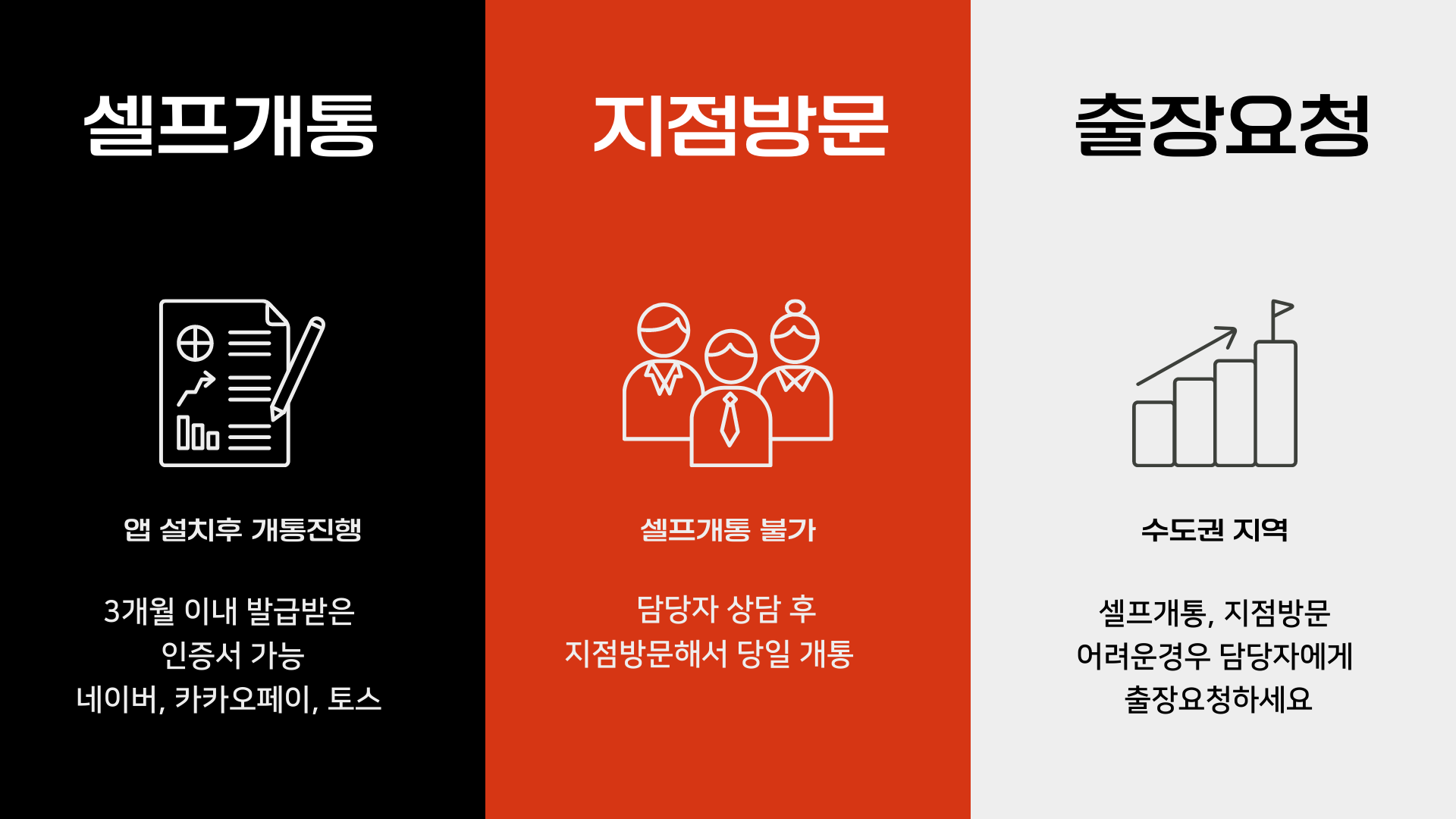 네이버, 카카오페이, 토스 인증이 안되는 경우가 있습니다. 연체로 핸드폰이 정지되기 전에 3개월 내로 인증을 받아놓지 않은 경우 비대면 셀프개통 진행이 불가능합니다. 이런 경우 담당자와 상담을 통해서 지점을 방문해서 개통하시게 됩니다. 방문하실 분의 지역, 성함, 방문날짜, 시간 등을 말씀해주시면 예약을 통해 진행됩니다. 전국 약 100여곳의 지점에서 개통이 가능하니 셀프개통이 어려운 분의 경우에는 연락주시기 바랍니다.