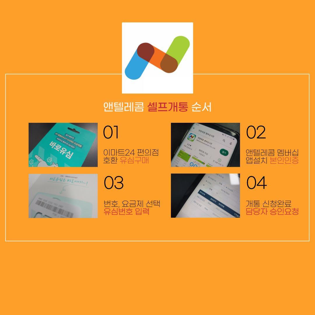 앤텔레콤 멤버십 K망 앱을 설치하셔서 미리준비한 유심을 통해 셀프로 개통을 진행하는 방법입니다. 호환되는 유심은 현재는 이마트24에서 판매하는 민트색 바로유심입니다. 또는 멤버십 앱에서 바로유심을 주문하셔도 됩니다(6,600원 선결제). 유심이 준비되면 네이버, 카카오페이, 토스, 신용카드 4가지 중 한가지만 인증을 통과하시면 셀프개통 접수가 가능합니다.